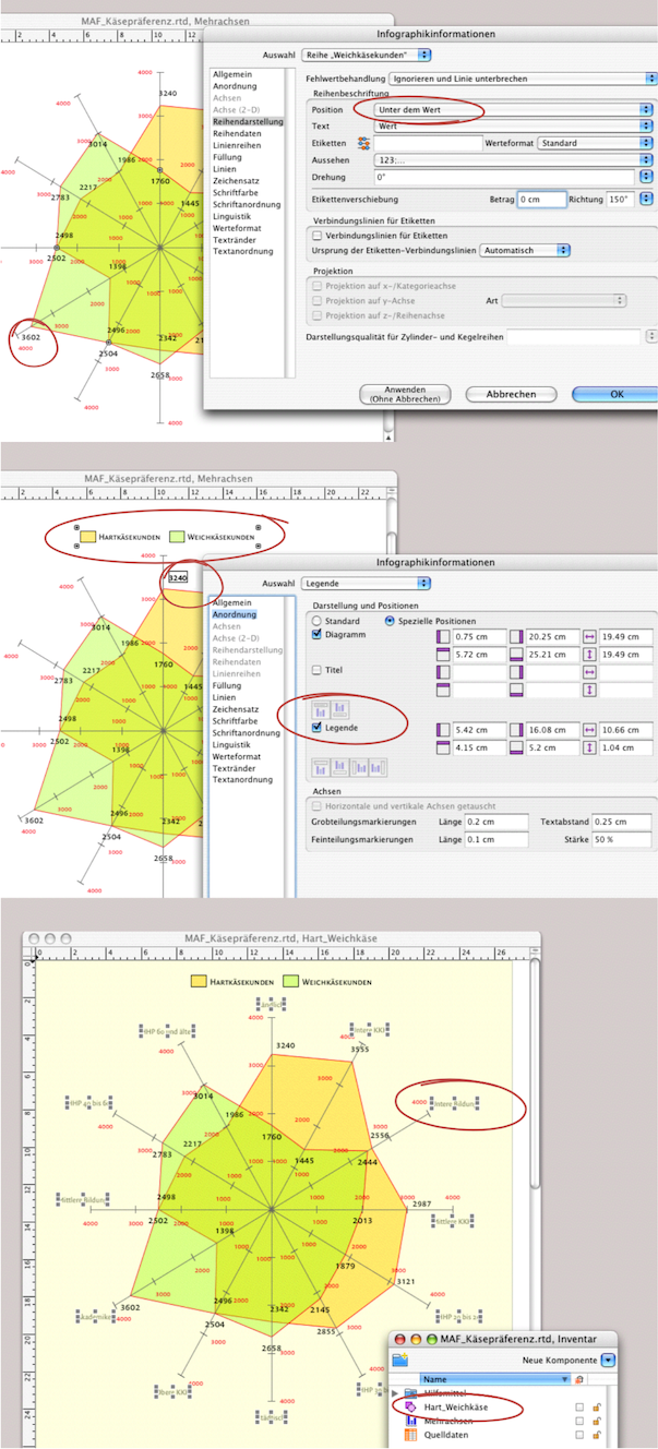 Die mehrachsige Grafik ist somit komplett. Wie Sie gesehen haben, können Sie auch während der Arbeit jederzeit von einer Komponente in die andere wechseln. Grundsätzlich ist es empfehlenswert, für etwas aufwändiger gestaltete Infografiken in der Zeichnungskomponente zu arbeiten. In der Zeichnungskomponente können Sie – außerhalb des sichtbaren Fensters – auch das Rechenblatt mit den Quelldaten unterbringen, um bei jedem Kopieren oder bei jeder Datenübermittlung gleich alles in einem „Paket“ zu haben. Das gilt insbesondere, wenn Sie sich ein Archiv mit Infografiken anlegen.