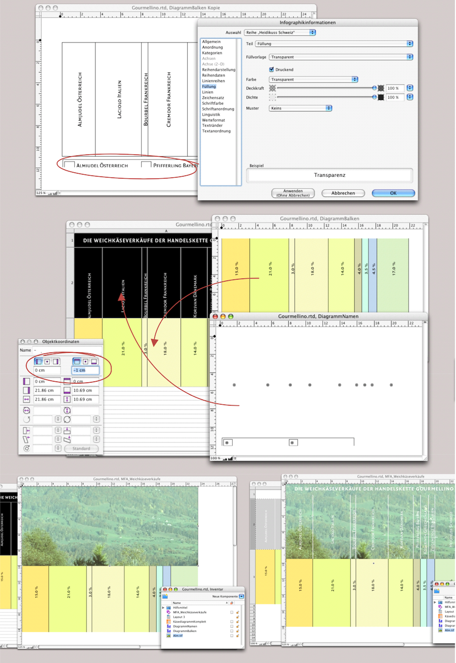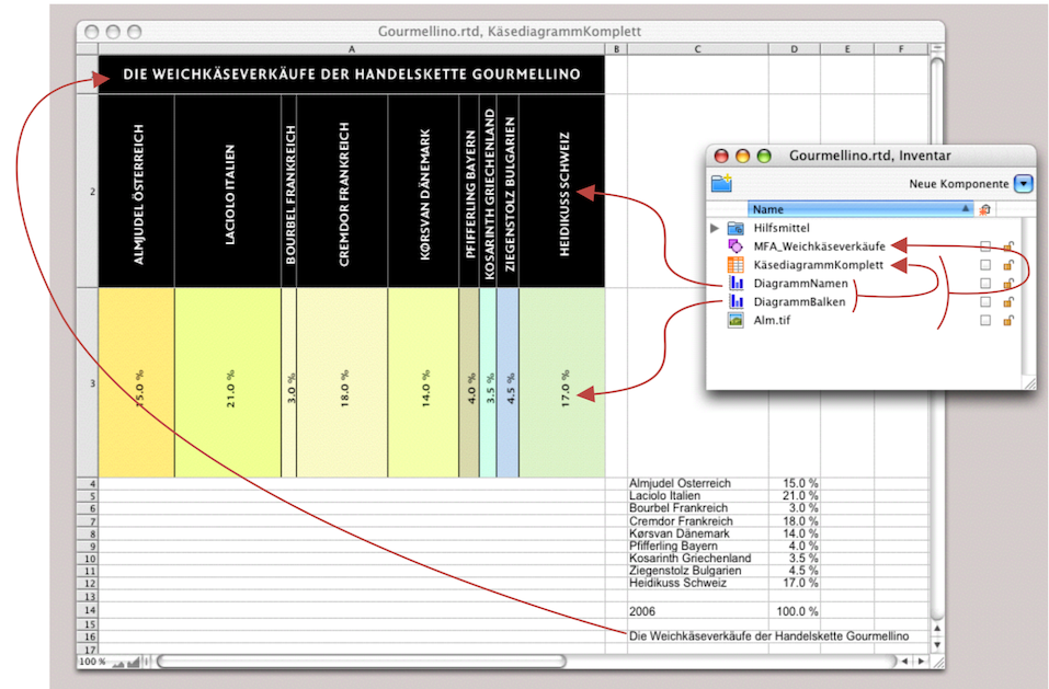In der Zelle A1 besteht eine Referenz zu Zelle C16, dem Titel der Quelldaten. Im Inventar wird deutlich, wie das Diagramm aufgebaut ist: Das offene Fenster ist das Rechenblatt «KäsediagrammKomplett». Die Zelle A2 enthält die Infografik «DiagrammNamen», die Zelle A4 die Infografik «DiagrammBalken». Das Rechenblatt befindet sich zusammen mit dem Bild «Alm» in der Zeichnungskomponente «MFA_Weichkäseverkäufe».