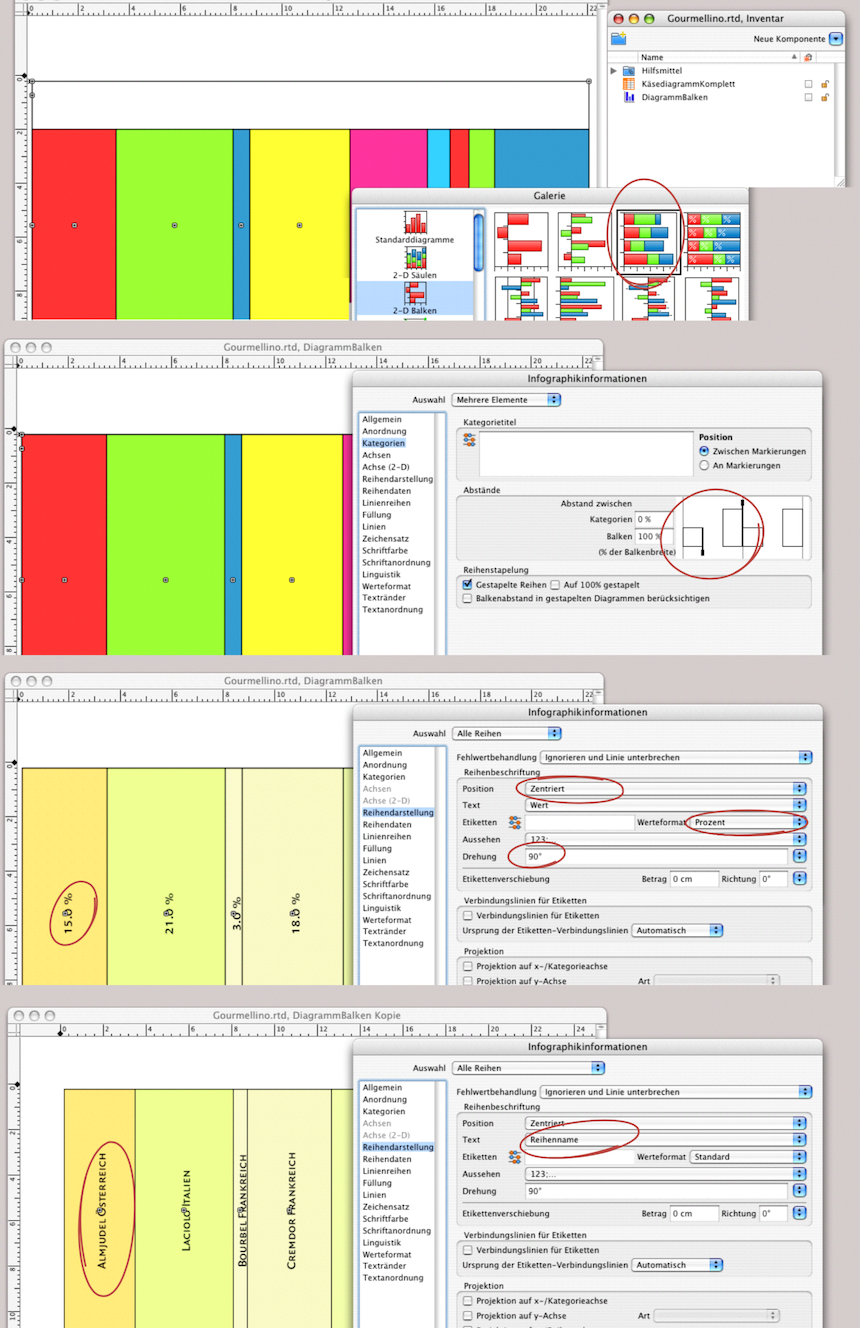 Nun gehen Sie daran, alle Reihen in der Grafik «DiagrammNamen» (so haben wir die Kopie der ersten Grafik benannt) mit der transparenten Füllvorlage zu versehen. Leider geht das nicht mit einem gemeinsamen Befehl über «Alle Reihen», Sie müssen also jede einzelne Reihe auswählen und auf transparent setzen. In Abb. 4.35 Mitte sind sowohl die beiden Grafiken wie das Rechenblatt in einem eigenen Fenster sichtbar. Hier sind auch bereits die beiden Grafiken aus dem Inventar in die Zelle A2, bzw. A3 gezogen worden. Wenn beide Infografikfenster offen sind, können Sie wenn nötig die Grafiken auswählen und mit Hilfe der Palette «Objektkoordinaten» so positionieren, dass sie in den Rechenblattzellen optimal ausgerichtet sind. Falls der obere oder untere Teil der Grafik höher oder kürzer erscheinen soll, brauchen Sie lediglich die Zeilenhöhe zu variieren. Um übrigens die Balken mit den Prozentwerten in der Grafik zu verkleinern, müssen Sie unter «Infografikinformationen ➝ Alle Reihen ➝ Kategorien ➝ Abstände» unter Kategorien einen höheren Prozentwert eingeben oder den rechten Schiebebalken nach links ziehen (siehe Abb. 4.35 Mitte).