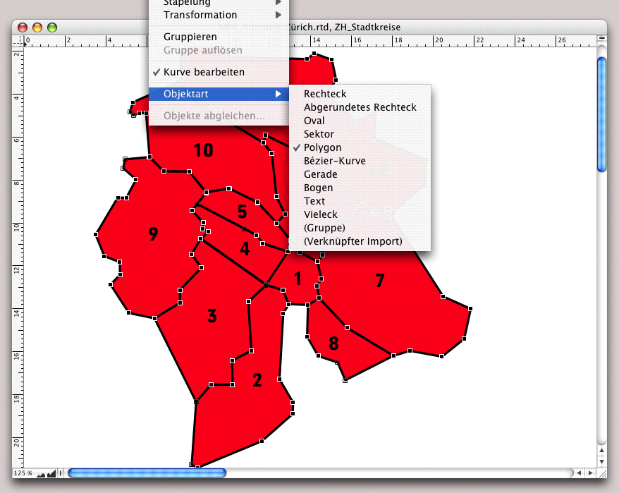 Gehen wir zuerst von der Form aus: Suchen Sie sich eine geografische Karte, auf der die für Ihre statistische Darstellung maßgebenden Grenzen deutlich sichtbar sind, am besten ungefähr DIN A4 groß. Sie können nötigenfalls das Bild in RagTime skalieren. Solche Karten finden Sie auch im Internet. Sonst müssen Sie eine Vorlage einscannen, auf der Sie ggf. die Grenzen mit einem Filzstift nachgezogen haben. Wie Sie beim Zeichnen der Karte vorgehen, ist im Kapitel 2.6 „Zeichnen von Standortplänen“ im Zusammenhang mit dem Zufahrtsplan der YesNon-Schule erläutert. Hier nur zur Repetition eine Zeichnung im Zusammenhang mit unserem Beispiel. In Abb. 4.37 ist dargestellt, was wir anstreben: Jedes Teilgebiet wird als Polygonzug gezeichnet und jeder Polygonzug wird später zum Container für eine Rechenblattkomponente.