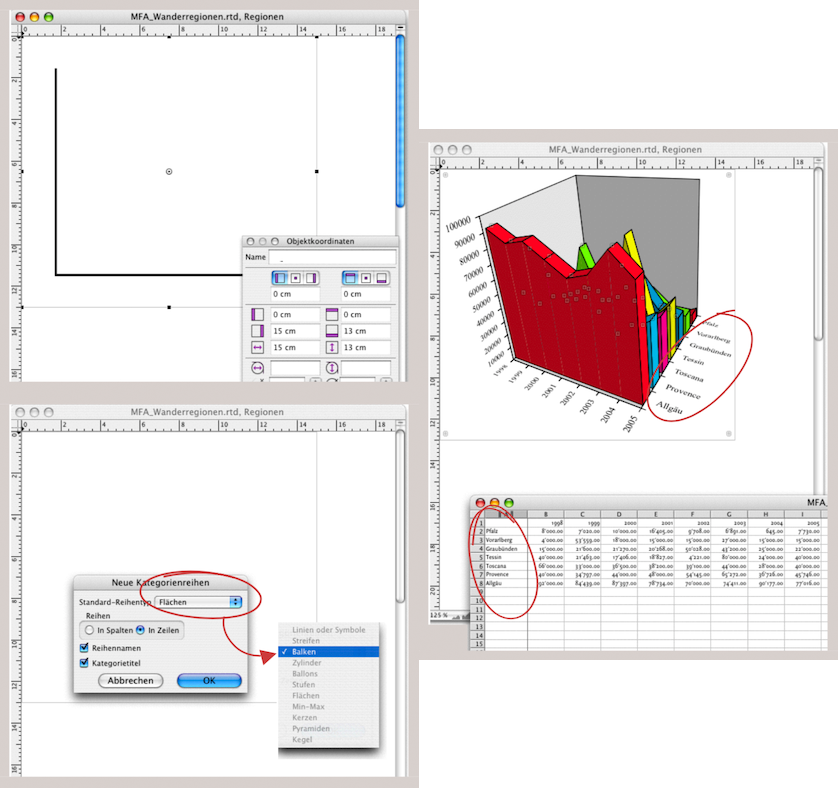 So fängt in RagTime fast jede Anleitung an. Wenn Sie das Inventar geöffnet haben, wählen Sie «Neue Komponente ➝ Zeichnung». Ziehen Sie in der Zeichnung mit Nullpunkt 0/0 einen Rahmen auf, ca. 15 x 13 cm, weisen Sie dem Rahmen die Komponente «Infografik» zu wie in Abb. 4.4 oben. Dann kopieren Sie von Ihrer Quelldatei die relevanten Daten – in unserem Fall vom Rechenblatt den Zellbereich A1:I8. Klicken Sie in die Infografikkomponente und wählen «Einsetzen» AV/•V. Jetzt können Sie in einem kleinen Fenster auswählen, wie die Zeilen bzw. Spalten in die Infografik eingefügt werden sollen. Und gleichzeitig können Sie über ein Auswahlmenü die Diagrammart – für unsere Beispiel «Balken» – wählen. Nach der Bestätigung mit «OK» erscheint bereits die Infografik wie in Abb. 4.4 unten.