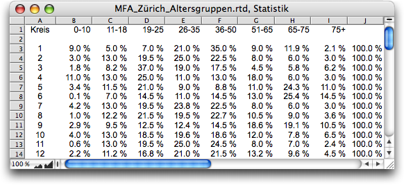 Jetzt sind wir bereit, um uns der eigentlichen Statistik widmen zu können. Da lohnt es sich, einen Moment zurückzulehenen und zu überlegen, was genau gemacht werden soll. Im Rechenblatt «Statistik» sind die Anteile der verschiedenen Altersgruppen in jedem Stadtkreis aufgeführt. Nur eine dieser Altersgruppen kann gleichzeitig grafisch dargestellt werden.