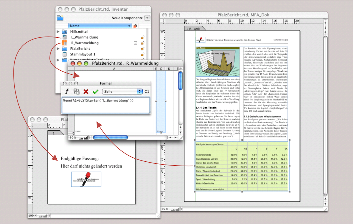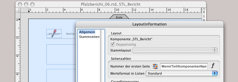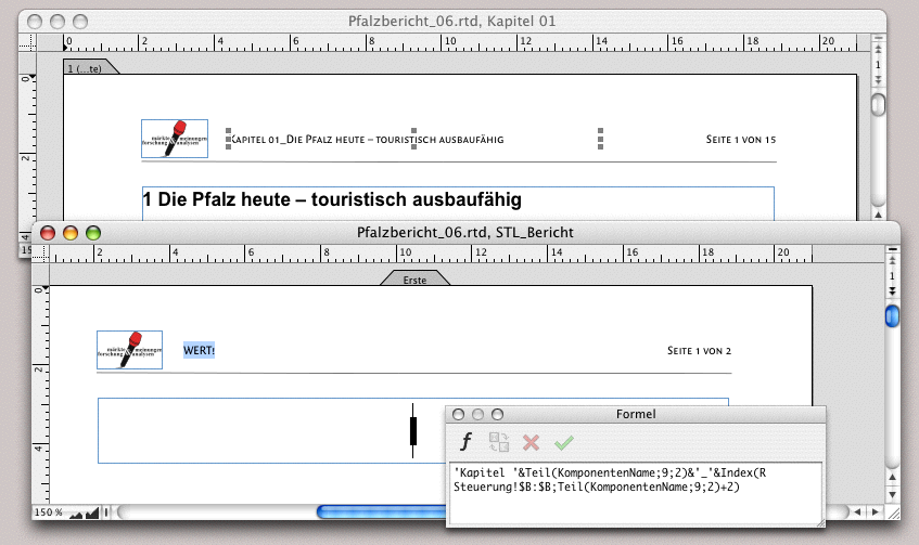 In Abschnitt 3.5.1 „Automatische Kapiteltitel“ haben wir aufgezeigt, wie ein Layout mit automatischen Kapiteltiteln zu erstellen ist. Hier gehen wir eine Stufe weiter und nehmen an, dass das MFA-Marktforschungsinstitut einen sehr umfangreichen Bericht erstellt. Die einzelnen Kapitel sind mit Infografiken, Tabellen und Bildern so komplex, dass für jedes Kapitel ein eigenes Layout erstellt wurde. Bei einem solchen Dokument stellen sich einige Probleme. Um die Seitennummern der einzelnen Kapitellayouts zu verknüpfen hat RagTime eine gute Lösung. Aber die Kapitelnummerierung kann dagegen nicht ohne weiteres automatisiert und muss mit einer komplexen Formel erstellt werden.