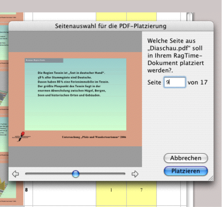 Erstellen Sie, wenn Ihre Diaschau fertig ist, ein PDF. Klicken Sie dann in die Zelle des Rechenblattes , wo Ihr erstes, verkleinertes Bild stehen soll (im Beispiel A9) und rufen Sie «Ablage/Datei ➝ Importieren…» auf. Jetzt können Sie das soeben erstellte PDF auswählen und RagTime zeigt ein Fenster für die Seitenauswahl dieses PDF-Dokumentes (siehe Abb. 4.53). Sie sehen nicht nur eine verkleinerte Darstellung jeder Seite, Sie sehen auch, wie viele Seiten insgesamt vorhanden sind. Mit dem Auslösen des Knopfes «Platzieren» wird die PDF-Seite eingefügt. Natürlich braucht es bei größeren Präsentationen ein wenig Zeit, bis auf diese Weise alle PDF-Abbildungen ins Rechenblatt eingefügt sind. Darum ist es klar, dass sich der Aufwand nur lohnt, wenn mit den einmal erstellten Dias öfters gearbeitet werden muss. Sobald die Präsentation als solches ändert, in einzelnen Seiten oder mit zusätzlichen Seiten, müssen Sie erneut ein PDF erstellten, und die geänderten Seiten im Rechenblatt neu einfügen.