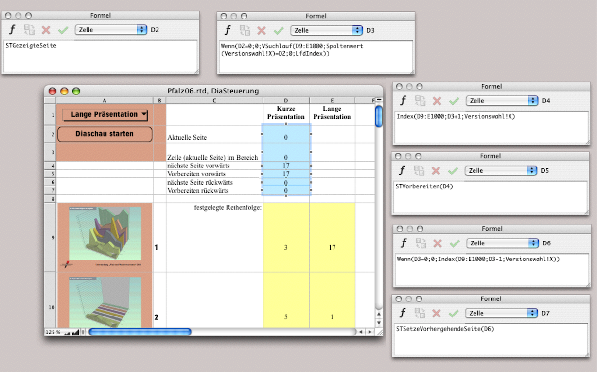 In Zelle D3 wird – wieder in Entsprechung zum Auswahlknopf – zur aktuellen Seite eine Indexzahl weitergefahren. Während in Zelle D5 die nächste Seite vorbereitet wird, rechnet RagTime mit der Formel in Zelle D6 auch wieder diejenige Seite, die in der manuell festgelegten Reihenfolge als vorherige Seite zu zeigen ist, was dann mit der Formel in D7 auch ausgeführt wird. Diese Rückwärtsberechnung ist notwendig, weil sich SlideTime sonst auf die vorherige Seite im Layout bezieht. Bei der manuell eingegebenen Reihenfolge kann dies aber eine völlig andere Seite sein.