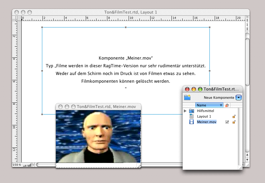 Es wäre nahe liegend, wenn RagTime 7 schon eine Komponente besitzt, die sich «Ton» nennt, dass Sie eine Diaschau auch mit Ton unterlegen könnten. Diese Komponente ist nicht neu und sie hat leider auch keine Neuerung erfahren. Das ist schade, denn diese Komponente ist schlicht eine unbrauchbare Krücke. Nicht, dass sie nicht funktionieren würde. Tonaufzeichnungen sind möglich. Mit einem Rahmenwerkzeug aus der Werkzeugleiste einen Rahmen mit der Bezeichnung «Ton» aufziehen. Oder einen leeren Rahmen unter «Zeichnung ➝ Inhaltsart ➝ Ton» in eine Tonkomponente verwandeln. Die Komponente zeigt daraufhin im Zentrum eine rote Punkttaste