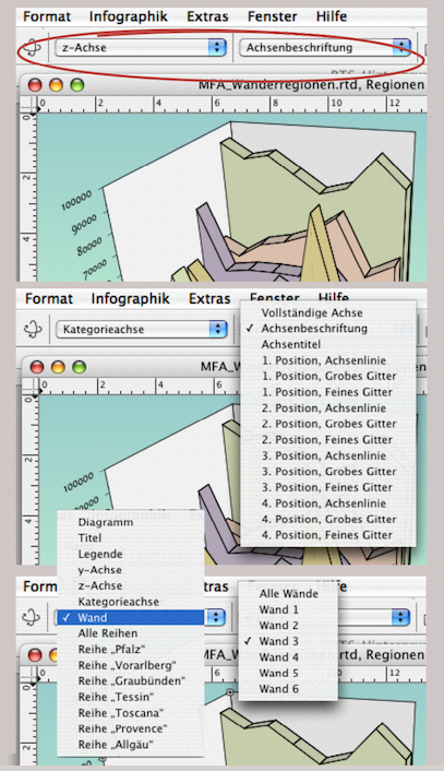 Weil in komplexen Diagrammen einzelne Elemente verdeckt sein können und dann schlecht mit dem Zeiger auszuwählen sind, gibt es bei der Komponente Infografik in der Werkzeugleiste spezielle Auswahlmenüs (siehe Abb. 4.6). Je nach ausgewähltem Element (Achse, Wand, Kategorienachse, Reihe usw.) ändern sich die Auswahlmenüs. So sind alle Elemente über diese Menüs erreichbar.