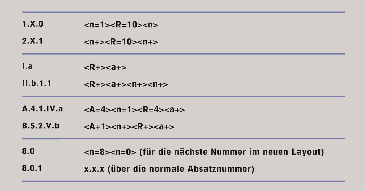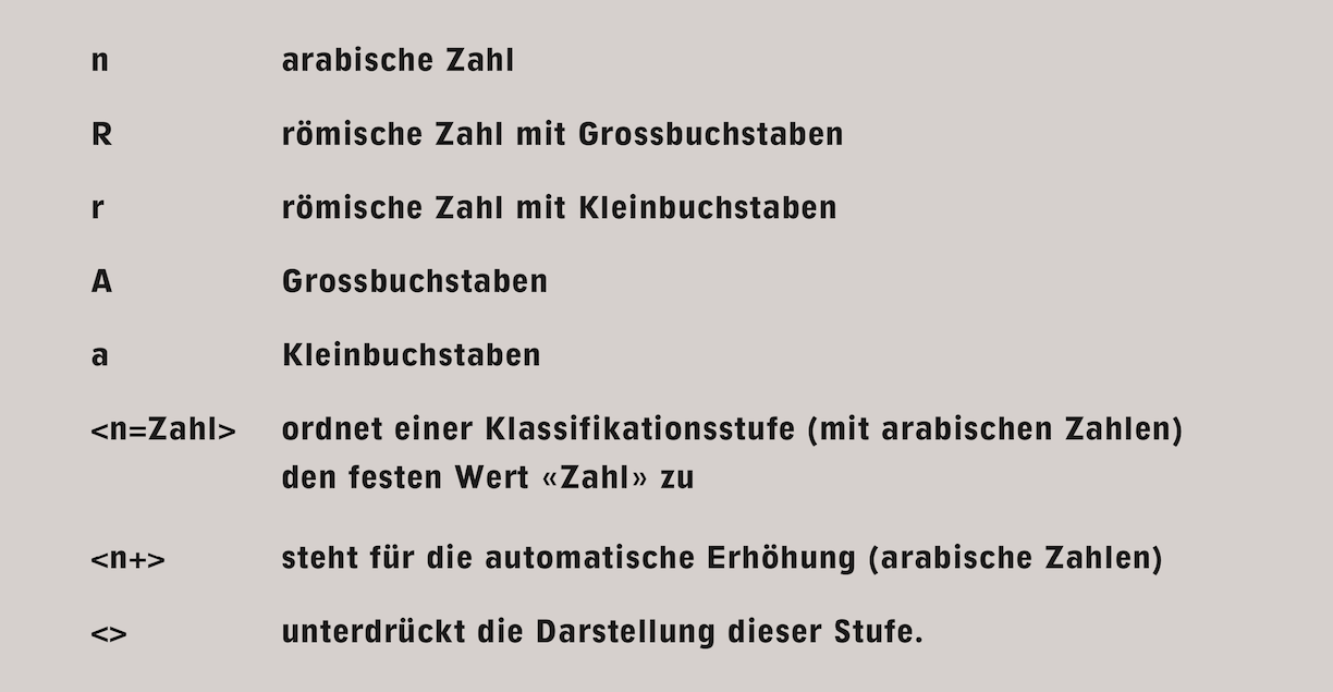 Die vorbereiteten Befehle für Absatznummern in RagTime unterstützen bis 4 Stufen der Dezimalklassifikation. Für zusätzliche Stufen oder gemischte Darstellung (arabische Zahlen, römische Zahlen, Buchstaben) gilt die Konvention in Abb. 4.65. Mit jeder neuen Eingabe unter «Text ➝ Absatznummer ➝ xyx» zählt RagTime die nächste fortlaufende Nummer, wobei «xyx» für Ihre gewählte Zählkonvention steht.