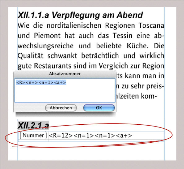Wenn Sie wirklich eine komplexe Struktur bei Ihrer Absatznummerierung haben, kann es leicht sein, dass Sie den Überblick verlieren. Dafür lässt sich eine kleine, einfache Hilfe bauen: Öffnen Sie sich ein Rechenblatt und installieren Sie in Zelle A1 einen Knopf. Nennen Sie ihn «Nummer» und setzen Sie in der Informationstafel unter Befehl «Absatznummer» ein. Die Einstellung «Index ist Resultat» muss ausgewählt sein. Nun klicken Sie in Ihrem Layout, in welchem Sie die komplexen Nummerierungen eingeben möchten, an die letzte Stelle Ihres Textes. Ziehen Sie das soeben erstellte Rechenblatt als mitlaufende Komponente in den Text. Verkleinern Sie die Komponente so, dass Sie nur zwei Zellen sehen: Die Zelle A1 mit dem Knopf und die Zelle B1 für Ihren „Absatznummer-Spickzettel“. Der mitfließende Rechenblattcontainer ist in Abb. 4.67 rot eingekreist. Wenn Sie den Knopf auslösen, öffnet sich das Eingabefeld für die Absatznummern. Geben Sie die gewünschte Nummerierungsformel ein. Dann kopieren Sie, bevor Sie die Eingabe bestätigen, Ihre Nummerierungsformel. Nach dem Bestätigen setzen Sie Ihre Formel in die Zelle B1 des mitlaufenden Rechenblattes. So haben Sie auch viele Seiten später noch Ihre letzte Eingabe vor Augen. Verfahren Sie dann bei jeder neuen Nummerierung wie eben beschrieben. Wohlverstanden: Die Formel bietet nicht die Möglichkeit, komplexe Kapitelnummern mit einem Befehl einzusetzen. Absatznummer-Formeln haben rein gar nichts mit den Rechenformeln von RagTime zu tun und es besteht keine Interaktionsmöglichkeit. Hier handelt es sich lediglich um eine „mitfließende Gedankenstütze“.
