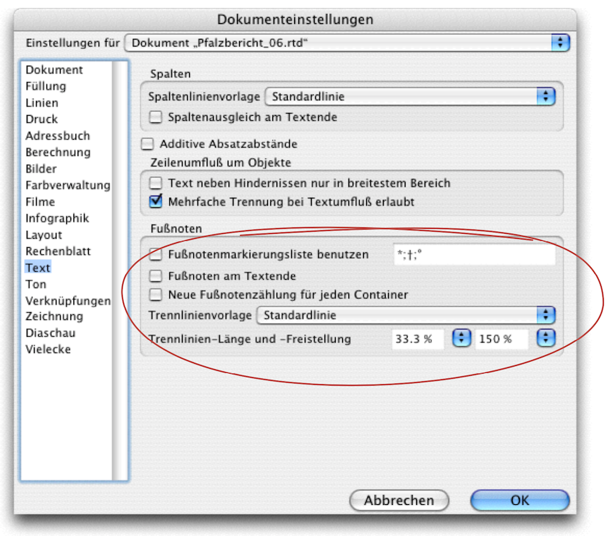 Die Einstellung «Markierung» erlaubt es, für eine ausgewählte Fußnote manuell ein Zeichen einzusetzen, das dann nur für diese eine Fußnote gilt. Unter «Automatische Markierungen» können Sie entweder numerisch oder mit Markierungssymbolen arbeiten. Im Eingabefeld haben Sie wieder zwei Möglichkeiten: Ein einzelnes Zeichen, das überall vorkommen soll, oder eine Reihe von Zeichen, die Sie mit einem Semikolon (Strichpunkt) unterteilen. Dann werden diese Zeichen der Reihe nach den Fußnoten zugeordnet. Haben Sie mehr Fußnoten als dort Zeichen vorhanden sind, beginnt RagTime wieder mit dem ersten Zeichen.