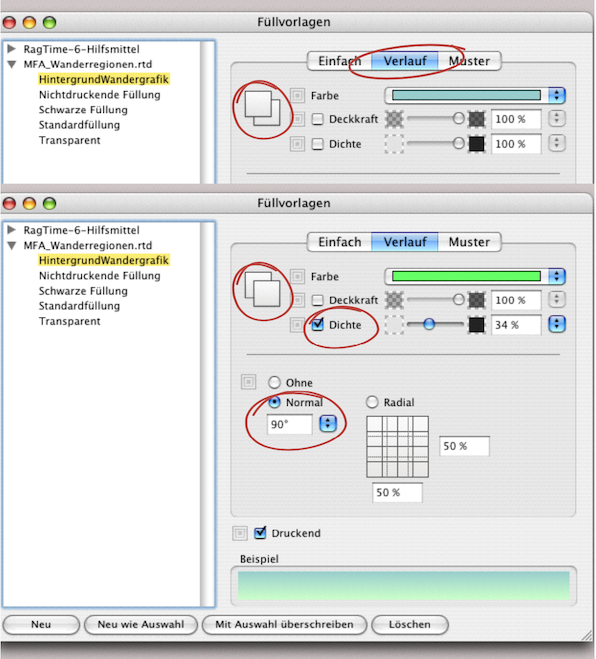 Ebenfalls gleich wie bei den anderen RagTime-Komponenten kann auch in der Infografik der Hintergrund des Containers eingefärbt werden. In unserem Beispiel ist es ein zweifarbiger Verlauf. Zur Repetition: Wählen Sie «Fenster ➝ Hilfsmittel ➝ Füllvorlagen» und klicken Sie «Neu». Wählen Sie außerdem «Verlauf». Hier können Sie die erste Farbe bestimmen. Die überlappenden Quadratsymbole zeigen an, ob Sie die erste oder die zweite Farbe ausgewählt haben (siehe Abb. 4.7).