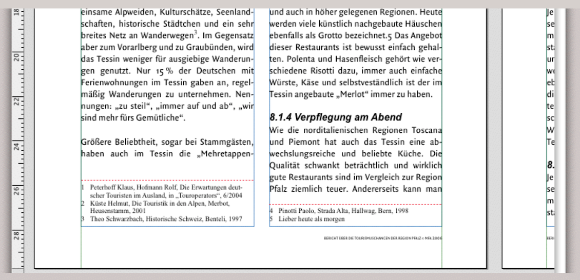 oder wählen Sie «Text ➝ Fußnote einfügen» und RagTime setzt bei der Einfügemarke im Text eine fortlaufende Zahl (oder ein gewähltes Zeichen) und je nach Einstellung am Seiten- oder Kapitelende eine Linie und das Fußnotenzeichen. Dort blinkt dann die Einfügemarke, um die Fußnote eingeben zu können. Schreiben Sie Ihre Fußnote und klicken Sie wieder in den Grundtext, um dort fortzufahren. Rein funktional nichts Kompliziertes, aber für die Gestaltung sind doch eine Reihe von Einstellungen nötig. Für einen einspaltigen Text über die ganze Breite des Satzspiegels ist auch das kein Problem. Doch sobald Sie mit zweispaltigem Layout arbeiten oder auch den Grundlinienraster verwenden, sieht die Typografie schon nicht mehr ganz so gefällig aus.