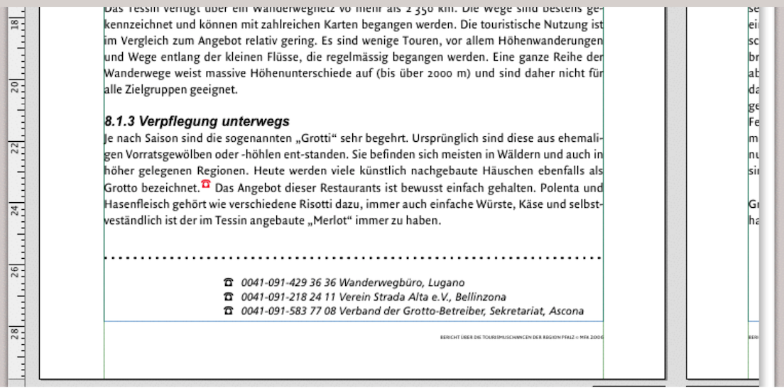 Wenn Sie ein spezielles Zeichen möchten, dass Sie nicht im aktuellen Zeichensatz haben, müssen Sie zuerst über «Bearbeiten ➝ Symbol einfügen» ein gewünschtes Zeichen suchen, es kopieren und anschließend wieder das Textinformationsfenster für die Fußnote öffnen, um es dort einzusetzen. Selbstverständlich sind nur Zeichen aus den Zeichensätzen möglich und keine Bilder oder Zeichnungen. Die nächsten Einstellmöglichkeiten betreffen die Nummerierung – ob fortlaufend durch die gesamte Textkomponente oder bei jedem neuen Container wieder von vorn beginnend. Das hängt auch mit Ihrer Layoutgestaltung zusammen. Genauso wie die Einstellung «Position». Haben Sie «Containerende» ausgewählt, wird bei einer zweispaltigen Satzgestaltung (mit zwei Containern) in beiden Spalten eine Fußnotenleiste erscheinen. Wollen Sie die Fußnoten zum Beispiel am Kapitelende haben, müssen Sie dort die Pipeline Ihrer Textcontainer unterbrechen und beim nächsten Kapitel wieder einen neue Pipeline beginnen.