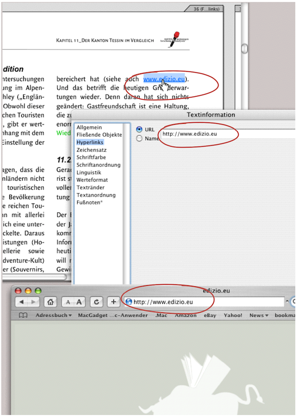 Die Arbeitsschritte für eine URL-Verknüpfung ist äußerst einfach: Schreiben Sie die Website-Adresse in den Text, streichen Sie mit dem Zeiger über die gesamte Adresse, damit diese aktiviert ist, und rufen Sie «Extras ➝ Als Verknüpfung markieren» auf. Wenn Sie mit dem Zeiger darüber fahren erscheint bereits das Händchen. Mit dem Klick öffnet sich die entsprechende Seite in Ihrem Browser (Abb. 4.74).