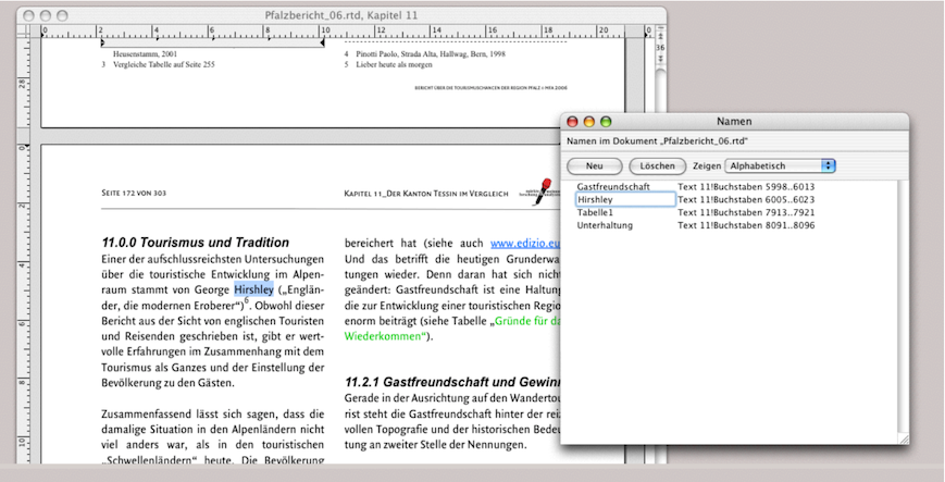 Wir haben in unserem Beispiel als Index eine Namensliste zusammengestellt. Wenn Sie mehrere Indexvarianten erzeugen möchten – zum Beispiel Namen getrennt, Jahreszahlen getrennt, Glossar-Begriffe getrennt – dann ist es einfacher, wenn Sie Ihr Layout kopieren und jeden Markierungsvorgang mit der abschließenden Index-Erzeugung getrennt vornehmen. Die Textdateien der einzelnen Index-Arten lassen sich im Inventar umbenennen. Ein solches Vorgehen ist je nachdem einfacher, als aus einem einzigen Index die verschiedenen Begriffe wieder zu separieren. Schließlich ist noch der Knopf «Quelle anzeigen» zu erwähnen: Einen Begriff in der Index-Palette auswählen, den Knopf klicken und RagTime zeigt die Textstelle im Dokument an, wo sich der markierte Begriff befindet. Ist das Layout im Hintergrund geöffnet, so bringt RagTime das Layoutfenster nach vorne. Ist nichts geöffnet, öffnet RagTime die entsprechende Textkomponente und zeigt die indexmarkierte Textstelle an.