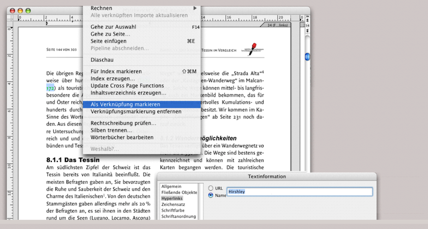 Die Verknüpfungen sind innerhalb eines Layouts über viele Seiten hinweg möglich. Das kann nicht nur für den Empfänger des Dokumentes nützliche Verweise ergeben, sondern auch dem Ersteller des Dokumentes hilfreich sein. Zum Beispiel, wenn ein längerer Text intuitiv entsteht und die Struktur der einzelnen Absätze erst am Schluss erfolgt. Dann können solche Links viel Sucharbeit ersparen.