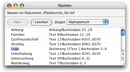 Das Springen von einer Textstelle zur anderen wird schon ein wenig aufwändiger. Weil RagTime wissen muss, wohin gesprungen werden soll, müssen Sie zuerst den Zieltext definieren. Das heißt, er braucht einen Namen. Überstreichen Sie mit dem Cursor das Wort und rufen Sie «Fenster ➝ Hilfsmittel ➝ Namen» auf. Dort geben Sie einen Namen ein. Dieser Name muss überhaupt nicht demjenigen Wort entsprechen, das Sie als Zieltext ausgewählt haben.