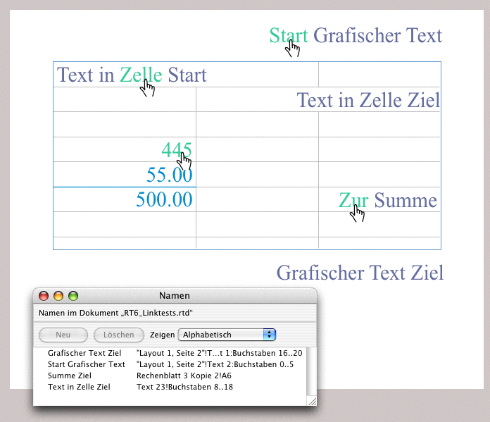 Im Dokument befindet sich ein Rechenblatt sowie zwei Grafische Texte. Mit Ausnahme der Zellen B2:B3 («Text in Zelle Ziel»), die als Inhaltsart «Text» aufweist, sind alle anderen Zellen ohne spezielle Inhaltsart. Die hellgrünen Texte mit den Händchen sind mit Links versehen. So führt «Start» im Grafischen Text zu den Wörtern «Zelle Ziel» im Rechenblatt. «Zelle» im Rechenblatt führt zu «Ziel» rechts unten im Grafischen Text, «Zur» führt zur Zelle A6 («500.00») und «445» in Zelle A4 führt wiederum zu «Zelle Ziel» in B2:B3.