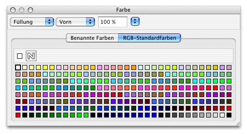 Unter «Format ➝ Farbe ➝ Andere» können Sie als Abreißmenü die Farbpalette auf den Bildschirm holen und für die Auswahl der in RagTime vorhandenen Standardfarben bereit halten. Noch einfacher kommen Sie zu dieser Palette unter «Fenster ➝ Paletten ➝ Farben» (siehe Abb. 4.8).