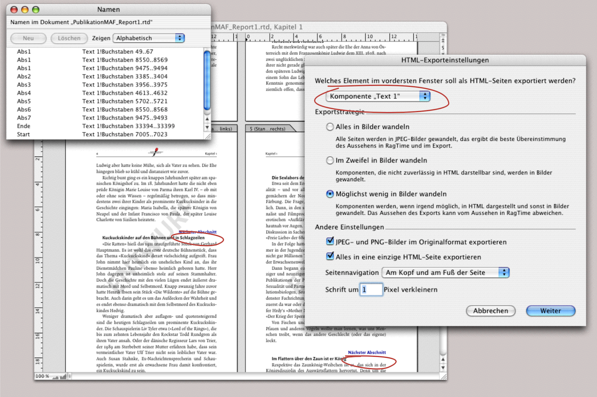Unter «Ablage/Datei ➝ HTML exportieren…» öffnet sich das Fenster «HTML-Exporteinstellungen». In Abb. 4.80 sehen Sie diese Tafel. Im ersten Auswahlmenü ist es möglich, entweder das ganze Layout oder eine Auswahl zu definieren. Ausgewählt ist immer die Komponente, die gerade mit dem Zeiger aktiviert ist. Hier ist es die Textkomponente. Außerdem ist bei der Exporteinstellung «Alles in eine einzige HTML-Seite exportieren» ausgewählt worden. Zuvor haben wir in dieser Textkomponente extra Verknüpfungstexte eingefügt (rot eingekreist). So gab es am Start einen verknüpften Text, der zum Textende führte und einen der zum nächsten Textabschnitt führte. Von jedem Textabschnitt ging wieder ein markierter Text zum nächsten usw. (siehe Palette «Namen» in Abb. 4.80). Im RagTime-Originaldokument funktionierte das, wie gewünscht. Nicht aber in der HTML-Seite auf dem Browser. Die Verknüpfungen funktionierten nicht. Schade für die Arbeit. Trotzdem, der Text war „internettauglich“ (siehe Abb. 4.81). Doch weiter zu den Exporteinstellungen. Die Hauptfragen bei «Exportstrategie» stellen sich so: Möchten Sie, dass das Layout so exakt wie möglich auf der Website erscheint? Dann gibt es nur die Auswahl «Alles in Bilder wandeln». Oder möchten Sie, dass Ihr Text direkt aus der Webseite kopierbar ist? Dann ist die Auswahl «Möglichst wenig in Bilder wandeln» richtig. Den mittleren Auswahlknopf nennen wir den „Zweifelknopf“, weil er Sie so oder so im Zweifel lässt, was dabei herauskommt… Sie werden sehen, dass Vieles mit dem HTML-Export zuerst mit Ausprobieren zu tun hat. Das gilt auch für die Einstellung «Schrift um … Pixel verkleinern». In der Regel führt hier eine 1 oder eine 2 zu einem besseren Schriftbild auf der Webseite. Unter «Andere Einstellungen» sind die Auswahlmöglichkeiten selbsterklärend. Unter «Seitennavigation» stehen die Optionen «Ohne», «Am Kopf», «Am Fuß» und «Am Kopf und am Fuß der Seite» zur Verfügung. Auf der Webseite erscheinen dann entsprechende Navigationstexte (siehe Abb. 4.83).