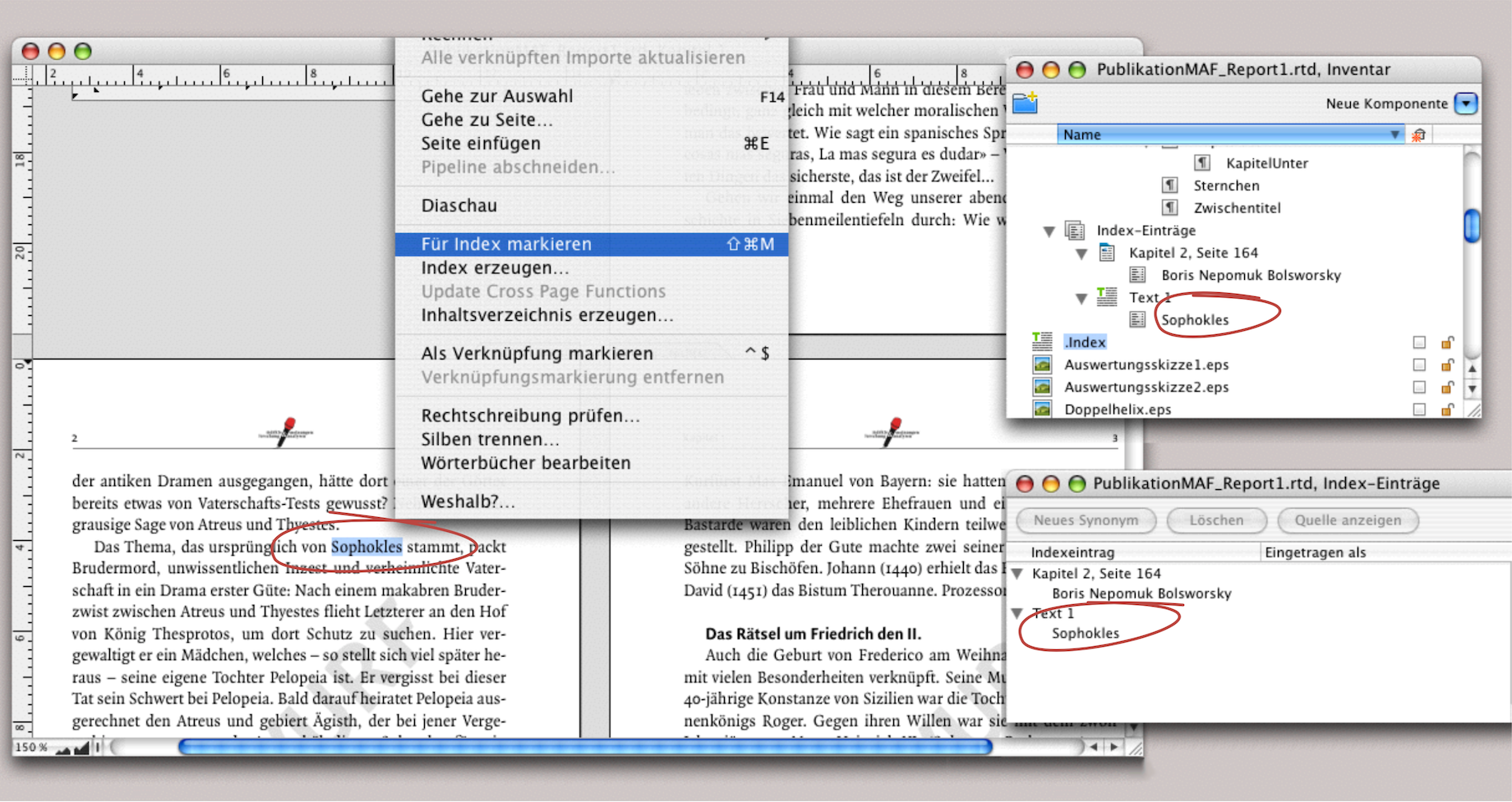 In Abb. 4.86 haben wir in einer Montage die verschiedenen Fenster und Paletten zusammengestellt. Im Layout ist der Begriff «Sophokles» markiert, danach wurde «Für Index markieren» ausgewählt (übrigens: Auch hier lässt es sich mit Tastaturkürzeln schneller arbeiten) und sofort erscheint der markierte Text in der Palette «Index-Einträge». Da bereits ein Index erzeugt wurde, ist im Inventar auch eine Textkomponente «Index» zu sehen. Im Ordner «Hilfsmittel» des Inventars erscheint eine Ikone, die wie ein Ordner die Hierarchieebenen des Index aufzeigt. Wenn Sie Einträge löschen möchten, können Sie das sowohl hier im Inventar als auch auf der Palette «Index-Einträge» tun.