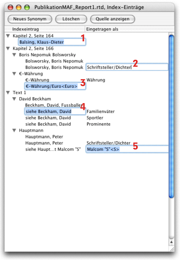 Fall 4: Im Grundtext steht «David Beckham» als markierter Indexbegriff. Im Index soll er erstens unter verschiedenen Stichworten (Synonymen) auftauchen und zweitens mit Hinweisen versehen sein. Erstellen Sie darum drei neue Synonyme. Im Hauptbegriff geben Sie «Beckham, David, Fußballspieler» ein, in den Synonym-Begriffen «siehe Beckham, David» und unter «Eingetragen als» die Stichworte, unter denen dieser Name aufgelistet werden soll (hier «Familienväter», «Prominente» und «Sportler»). In der Textkomponente ist dann unter jedem dieser Stichworte «siehe Beckham, David» zu finden.