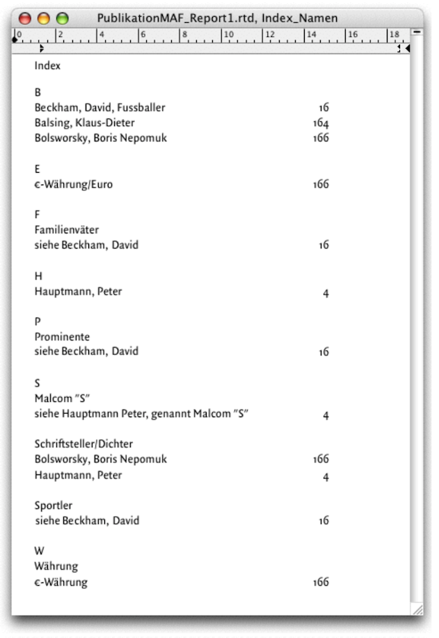 Ein RagTime-Werkzeug, das es schon lange gibt und welches sicher unentbehrlich ist, betrifft die Index-Funktionen. Ähnlich wie bei den Verknüpfungen gilt es auch hier, Texte als Wörter oder ganze Textstellen zu markieren. RagTime erstellt dann mit einer einzigen Befehlsfunktion («Extras ➝ Index erzeugen…») einen Index. Gehen wir die einzelnen Schritte wieder an einem Beispiel durch.