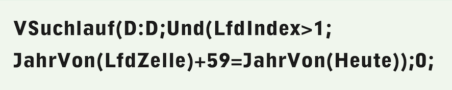 Die Suchlauffunktion ist hier im Prinzip gleich wie bei unserem Beispiel mit dem Lieferschein (Viel mehr als nur zählen). Nur ist hier das Auswahlkriterium nicht einfach ein Datum in einer anderen Spalte der gleichen Zeile. In unserem Falle müssen die Geburtsdaten in Spalte D des Rechenblattes «Personal» mit dem heutigen Datum verglichen werden. Am einfachsten ist es, aus den Geburtsdaten und dem heutigen Datum mit der Funktion «JahrVon» das Jahr zu extrahieren, wie in dieser Teilformel gezeigt: