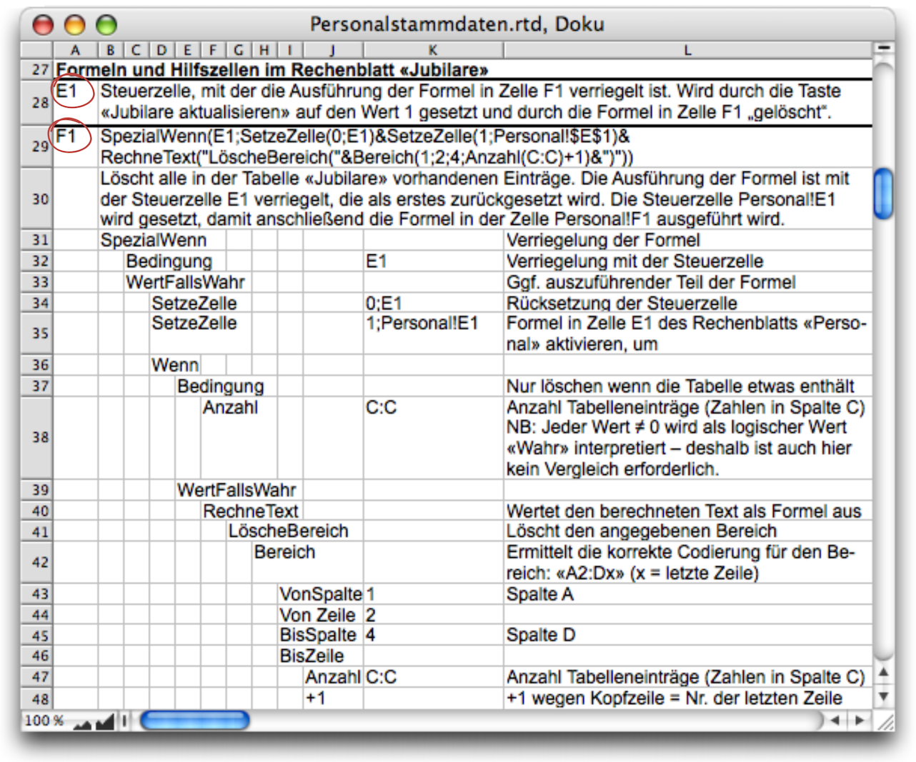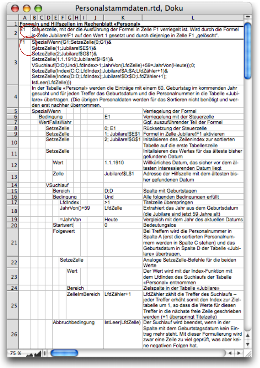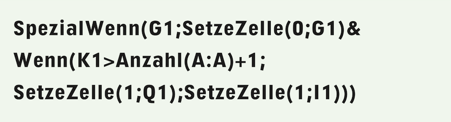 Ist die Bedingung erfüllt (eine 1 in E1), wird durch die Funktion «SetzeZelle» diese 1 sofort wieder durch eine 0 ersetzt. Damit wird die Formel wirklich nur ein einziges Mal ausgewertet! Gleichzeitig wird aber auch der Rest der Formel abgearbeitet. Dass als Bedingung in der Formel nicht «E1=1» steht, sondern nur E1, ist kein Druckfehler. Der Wert 1 steht ebenfalls als logischer Wert «Wahr» für die Erfüllung einer Bedingung und kann deshalb mit einer Referenz zur Zelle ohne Vergleich direkt abgefragt werden. Mit dem anschließenden SetzeZelle-Befehl wird ein Vorgang im Rechenblatt «Personal» ausgelöst, das Übertragen der Personaldaten der Jubilare in das entsprechende Rechenblatt. Aber vorher, und das ist der Zweck des Rests der Formel, muss eine eventuell noch vorhandene alte Jubilarentabelle gelöscht werden.