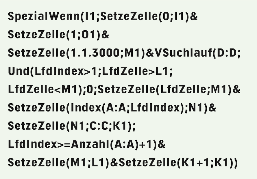 Die erste Teilformel kann eine weitere Steuerzelle aktivieren, die ihrerseits die nächste Teilformel freigibt. Auf diese Weise lassen sich beliebig viele Teilformeln aneinander reihen. Mit einem solchen Vorgehen wird die Fehlersuche gewaltig erleichtert. Das Anfügen weiterer Teilschritte beeinflusst die bereits getesteten Formeln nicht. Auch die Dokumentation ist für jeden der Teilschritte von den anderen Teilschritten unabhängig. Vorraussetzung ist natürlich, dass jede Teilformel für sich allein eine vollständige Formel ist, damit die Formeleingabe überhaupt abgeschlossen werden kann.