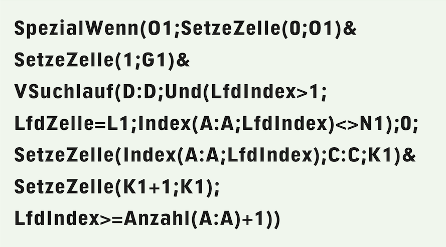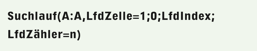 Der aktuelle Zählerstand wird durch die Funktion «LfdIndex» wiedergegeben (eine Funktion, die nur innerhalb von Suchlauffunktionen einsetzbar ist). Nicht nur die Zeile, auch die gerade geprüfte Zelle in der ersten Spalte des Suchbereichs kann mit einer Funktion abgefragt werden: Mit «LfdZelle». Als Beispiel:
