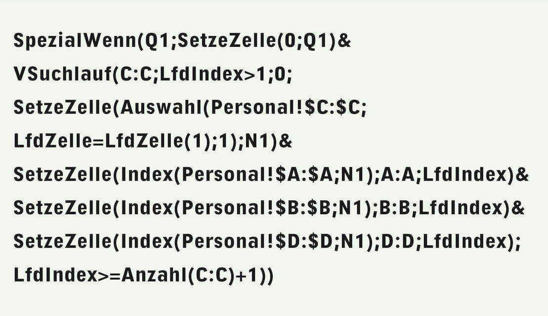 Abbruchbedingung für den Suchlauf ist die erste leere Zeile in der Personaltabelle. Zwar wird so eine Zeile zu viel untersucht. Um das zu vermeiden könnten wir unter Benützung der Index-Funktion mit (IstLeer(Index(D:D;LfdIndex+1))) eine Zeile vorausschauen. Hier bringt das keinen Vorteil. In anderen Fällen kann es aber wichtig sein, dass keine Zeile zu viel vom Suchlauf erfasst wird, vor allem wenn der «Folgewert» interessiert.