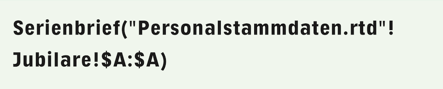 In obiger Formel F-3.20 ist die Funktion «LfdZelle» verwendet. Ebenfalls zulässig wäre «Spaltenwert», nicht aber die weiteren Spezialfunktionen, die nur innerhalb von Suchläufen benutzt werden können. Weiteres zu Serienbriefen finden Sie im Abschnitt 2.5.6 „Serienbrief mit Auswahl“.