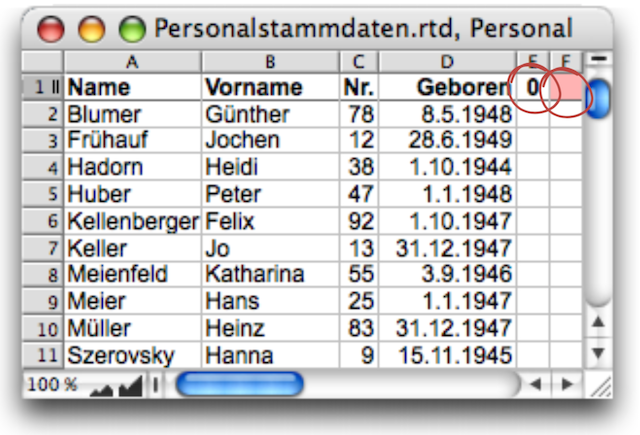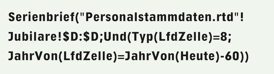 Die Serienbrieffunktion ist eigentlich auch eine Suchlauffunktion! Das wird vielfach übersehen. Die Funktion «LfdZelle» lässt sich deshalb auch in Argumenten verwenden. Möchten wir nur allen Jubilaren eine Einladung zum Jubilarenausflug schicken, die in diesem Jahr 60 werden, und interessieren uns gar nicht für eine separate, sortierte Tabelle, so könnte für Personal-Stammdaten, die gemäß Abb. F-3.4 angeordnet sind, auch mit «Serienbrief» gearbeitet werden. Dabei ist es wichtig, zu realisieren, dass bei Vorkommen mehrerer Serienbrieffunktionen im gleichen Dokument immer alle «Auswahlbedingungen» erfüllt sein müssen, damit der betreffende „Datensatz“ gedruckt wird. Das erlaubt uns, die Formeln aufzuteilen. Wenn Sie also in Ihrem Brief mit der Formel