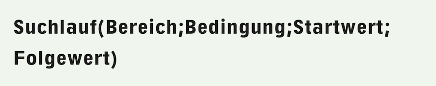 Vergessen wir die einfachste Form des Suchlaufs nicht: Mit zwei Argumenten, dem Bereich und der Bedingung, zählen Suchläufe – egal welcher Art – nur, wie oft die Bedingung im Bereich erfüllt ist. Der Wert der Funktion entspricht am Schluss dieser Anzahl. Die beiden anderen Formen, mit oder ohne Abbruchbedingung, unterscheiden sich nicht wesentlich. Es ist aber empfehlenswert, im Zweifelsfall eine Abbruchbedingung zu verwenden. Leicht wird vergessen, dass in der Formel für den «Folgewert» eine Funktion eingesetzt wird, die z. B. mit leeren Zellen einen Fehler produziert. Es gab schon mehrere Forum-Beiträge, die vermeintliche Suchlauffehler bemängelten, welche nur auf fehlende oder falsche Abbruchbedingungen zurückzuführen waren.