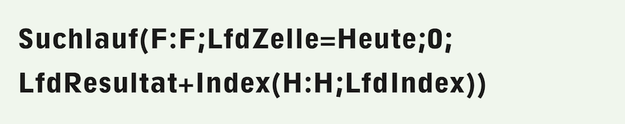 Hier (Formel F-3.12) zuerst einmal die ganze Formel, deren Dokumentation in Abb. F-3.7 zu finden ist. Wir haben dabei die Funktion «VSuchlauf» statt «Suchlauf» verwendet. Die Funktionen «Suchlauf» und «VSuchlauf», bzw. «HSuchlauf» sind austauschbar, wenn nur eine einzige Spalte/Zeile abgesucht wird. Intuitiv griffen wir hier zu «VSuchlauf», weil es eine Spalte abgesucht werden sollte.