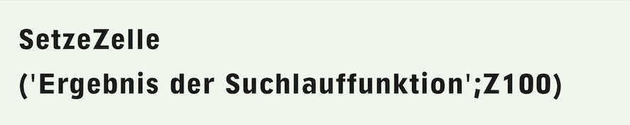 Gleichzeitig erscheint der Wert aber auch dort, wo die Formel selbst eingegeben wurde. Sie setzt also den Text «Ergebnis der Suchlauffunktion» in die Zelle Z100 und hinterlässt den gleichen Text dort wo die Formel steht. Natürlich wollen wir nicht diesen Text, sondern effektiv das Ergebnis der Suchlauffunktion einsetzen. Nach «SetzeZelle» folgt also unsere bisherige Suchlauf-Formel, sodass alles – fertig kombiniert – die Formel F-3.8 ergibt: