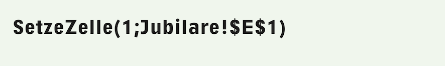 Den Mechanismus der Rücksetzung dieser Aktivierung und des Entriegelns einer nächsten Teilformel durch Aktivierung der Zelle «Jubilare!G1» brauchen wir nicht erneut zu erläutern. Der Vollständigkeit halber der Unterschied, falls statt «SpezialWenn» die Funktion «Wenn» verwendet würde: Wenn die Steuerzelle die Ausführung der Formel blockiert, lässt «SpezialWenn» den Inhalt der Zelle mit der Formel unverändert, während er bei Verwendung von «Wenn» gelöscht wird. – Nach denn zwei SetzeZelle-Befehlen des „Verriegelungs-Mechanismus“ folgen zwei weitere, welche Ausgangswerte für einen nachfolgenden Verarbeitungsschritt in Hilfszellen der Jubilarentabelle eintragen: