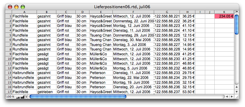 Die Formeln haben wir direkt in die Rechenblätter mit den Daten eingebaut. Natürlich könnten sie auch in einem separaten Rechenblatt stehen. So würden sie aber wegen der zusätzlich erforderlichen externen Rechenblattreferenzen bedeutend länger und damit schwerer lesbar. Es ist, vor allem beim Testen der Formeln, auch angenehm, auf Formeln und Werte im gleichen Fenster zugreifen zu können. Bei komplexen Dokumenten und Tabellen ist dieses Vorgehen allerdings weniger zweckmäßig.