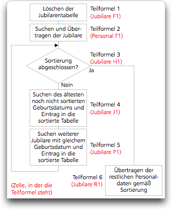 Nun aber zur Formel F-3.15 in Zelle «Jubilare!H1», die in Abb. F-3.8 als Teilformel 3 bezeichnet ist. Die Ausführung der Formel ist mit dem Wert von Zelle G1 in bekannter Weise verriegelt, welche durch den zweiten SetzeZelle-Befehl in Teilformel 2 im Rechenblatt «Personal» (Formel F-3.12) aktiviert wird. Sie ist relativ einfach zu interpretieren. Trotzdem, der Vollständigkeit halber, auch dafür die Dokumentation gemäß Abb. F-3.9. In verschiedenen Ablaufschritten müssen Werte in Hilfszellen abgelegt werden. In der Teilformel 4 muss z. B. der letzte bereits einsortierte Geburtstag und dessen Position in der Jubilarentabelle bekannt sein, damit nach dem nächsten gesucht, und dieser an der richtigen Stelle in die Tabelle eingetragen werden kann.
