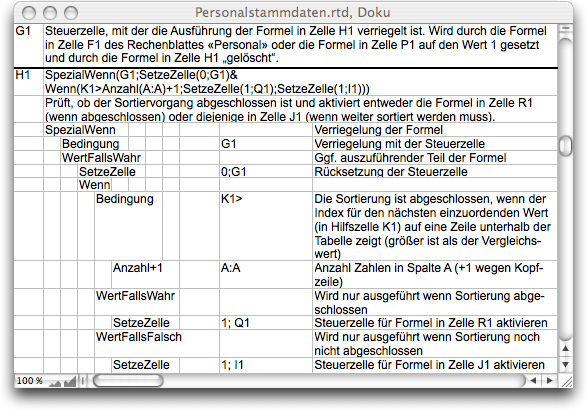 Schließlich wird jede verwendete Funktion mit ihren Argumenten erläutert. Jede Verschachtelung wird dabei durch entsprechende Einrückung sichtbar gemacht. Für die äußerste Funktion («SetzeZelle») finden sich die beiden Argumente in der nächsten Einrückungsstufe: Zuerst die Funktion «Suchlauf», mit welcher der einzusetzende Wert ermittelt wird, danach die Adressierung, wo dieser Wert eingesetzt werden soll. Analog ist die Suchlauf-Funktion in der nächsten Ebene „seziert“.