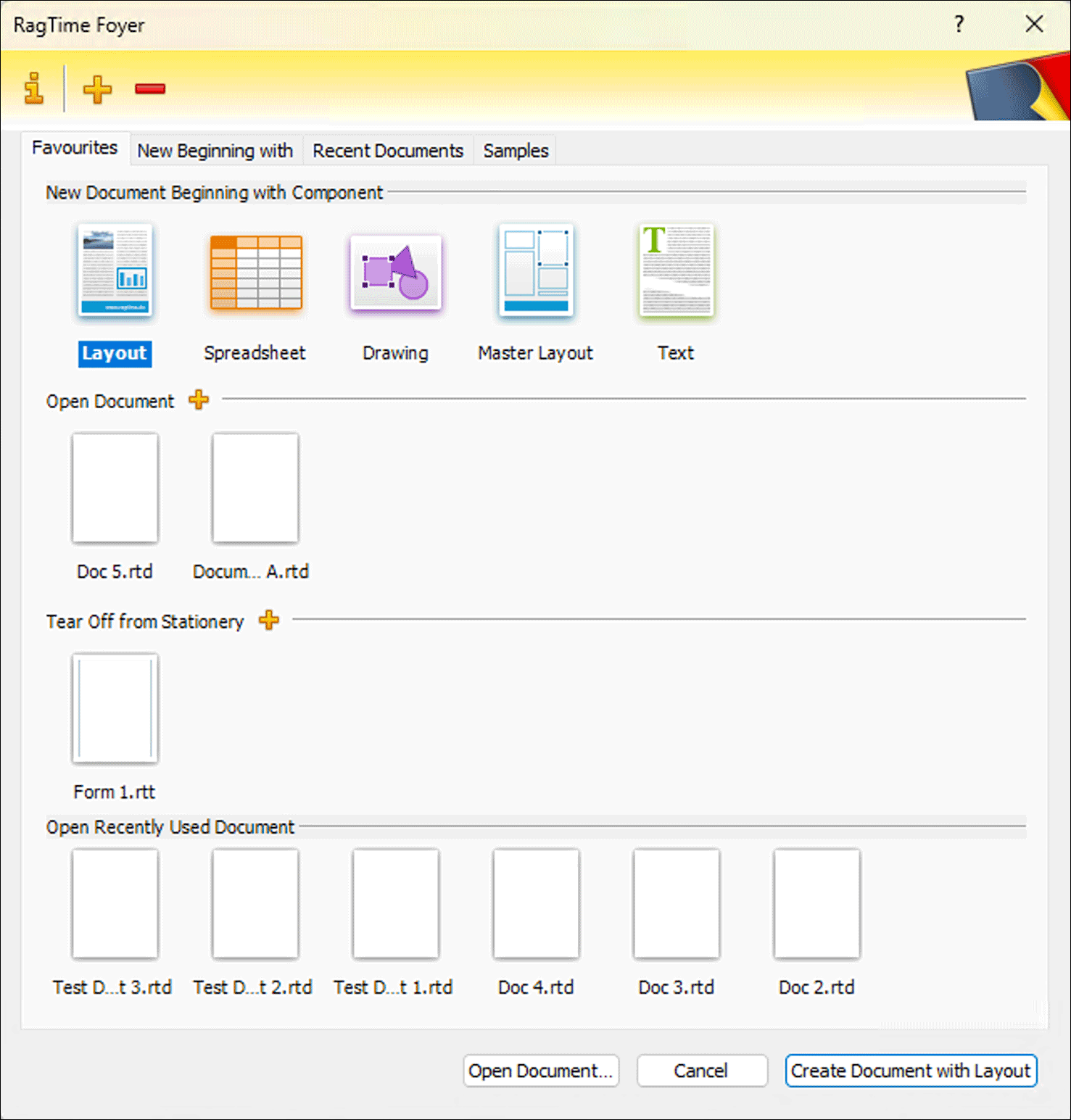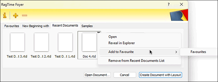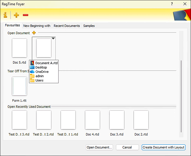 in the header bar of the Foyer window and add your own favourites panel for each project. If all documents of the project are stored in one folder, you can also make this project folder into your own Foyer panel, in which all documents contained in the respective folder that can be opened with RagTime are then displayed. RagTime documents have a preview, documents from other programs do not have a preview option. Whether to choose folder or favourites panel is decided in the window that opens first after clicking on