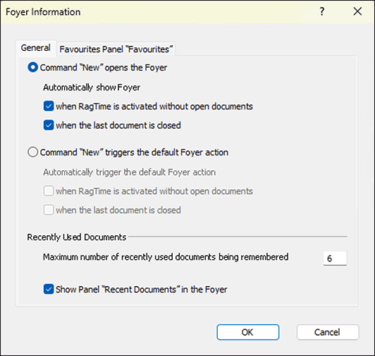 If in the «General» panel (see Fig. 1.2) the first radio button is active (it is by default), then RagTime starts with the Foyer. If, on the other hand, the second button is active, then RagTime starts with a freely selectable «Default Action» – more on that a bit later.