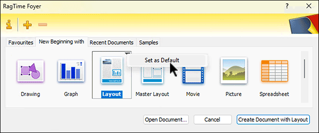 The «New Beginning with» panel (see Fig. 1.3) lists all components with which work on a new RagTime document can be started. The component types are displayed in alphabetical order, which cannot be changed. By default, «Layout» is selected as «Default Action» and therefore listed in bold and highlighted. This is also practical in most cases, but can be changed. More on that a bit later. The «Default Action» determines the command that is available in second place in the File menu. It can also be called with the keyboard shortcut shown with the menu command or the button at the bottom right in the Foyer window. If you do not make a different choice in the «New Beginning with» panel, a new document is always started according to the defined «Default Action», i.e., with a layout.