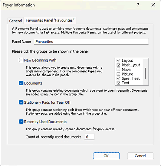 In the group «New Beginning with» you can select which component types should be available for creating a new document in the «Favourites» panel. If you practically always start new documents with a layout, you can also remove the checkmark for the whole group here – the remaining component types are still always available in the separate panel. The meaning of the other checkmarks for «Documents» and «Stationery to Tear Off» are explained in the Foyer panel.