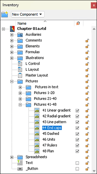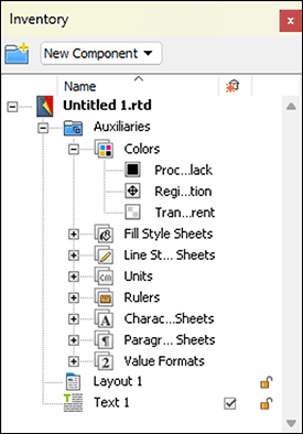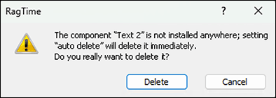 An example: you have a component in a layout page, say a text, where the checkbox in the Inventory is marked with √. Now you delete the frame that contains this component in the layout – or the entire layout page. The said text component will immediately disappear from the Inventory and is thus no longer present in the document. If the checkmark of the text component had been deleted in the Inventory, it would have remained in the Inventory during your deletion operation, so still present in the document. Be careful here! RagTime can only undo one single step . The probability is high that such an automatic deletion of a component is only noticed after another step. Then it is irretrievably deleted and thus possibly valuable work destroyed. If you notice it in time, the only rescue option is to close the document without saving and reopen it. – A component is automatically deleted only if it is not used in any other place in the document – e.g., in another layout. A reference in a formula is not enough!