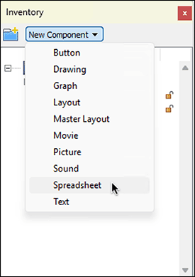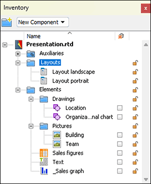 Each newly created component automatically receives a name with component type and sequential number, i.e., «Layout 1», «Text 1», «Picture 1», «Spreadsheet 1», etc. After two slightly delayed mouse clicks on one of these names, you can replace it with your own. Give as descriptive but short names as possible. It is good to know that you can “trick” the alphabetical sorting. If a component should be at the top in the Inventory, put an «A» or a space before the name, see Fig. 1.12 and Fig. 1.13. If the element should be listed last, start the name with «Z» or a special character, e.g., «_Button». In Fig. 1.12, the Inventory is sorted descending. – However, you cannot rename the «Auxiliaries» folder. It is always listed at the top in the Inventory. It also cannot be duplicated or moved to another Inventory.
