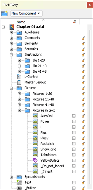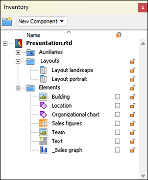 It is therefore worth paying attention to these checkmarks in the Inventory. If you create a new component within another component, e.g., by inserting in a layout page, this component appears in the Inventory automatically with a checkmark.