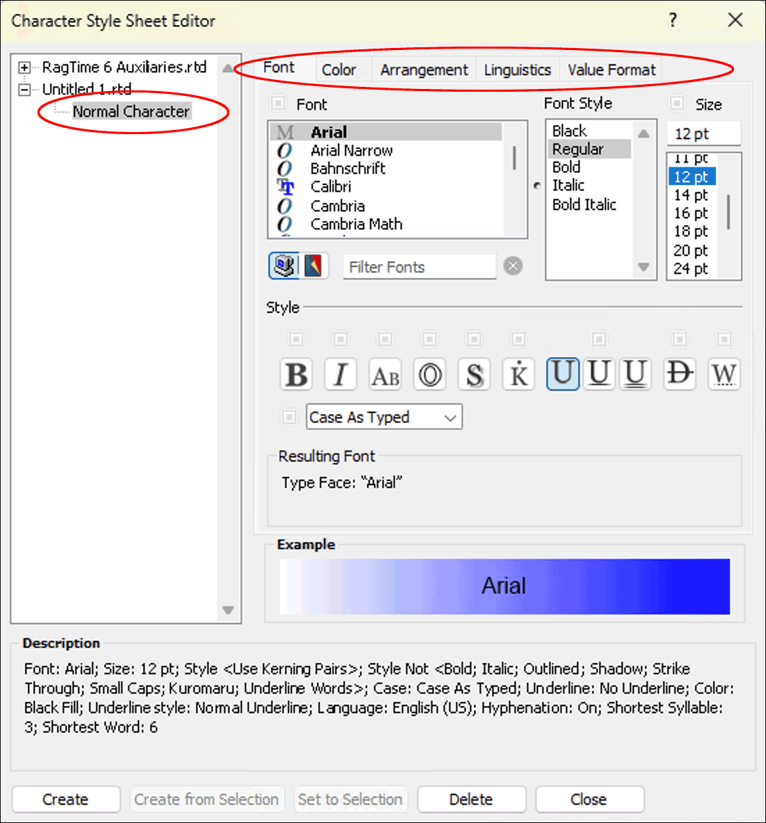 RagTime offers the «Normal Character» style sheet twice. Once under «RagTime 6 Auxiliaries» and once for the currently active document (see Fig. 1.15 top left). In the first case, the formatting of the normal character applies to all RagTime documents that you will open in the future. In the second case, it logically applies only to the relevant document. By the way, the «Normal Character» style sheet cannot be deleted and it should not be renamed – although this is possible – since certain operations assume the presence of this style sheet, and if it is missing, a new one with this name is created.