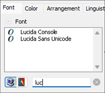 On the «Font» panel, select from your loaded fonts the one you want to use generally in your documents. You can select below the list on the left with the two icons which font list should be displayed, either all fonts installed on the computer, or only those already used in the document. In the field to the right of these icons, you can enter the beginning of a font name, e.g., «Luc» for «Lucida» – but the computer icon must be activated to search among all installed fonts. This way, only the available Lucida fonts are listed. Now you can select the style sheet and assign the found font to it (see Fig. 1.16).